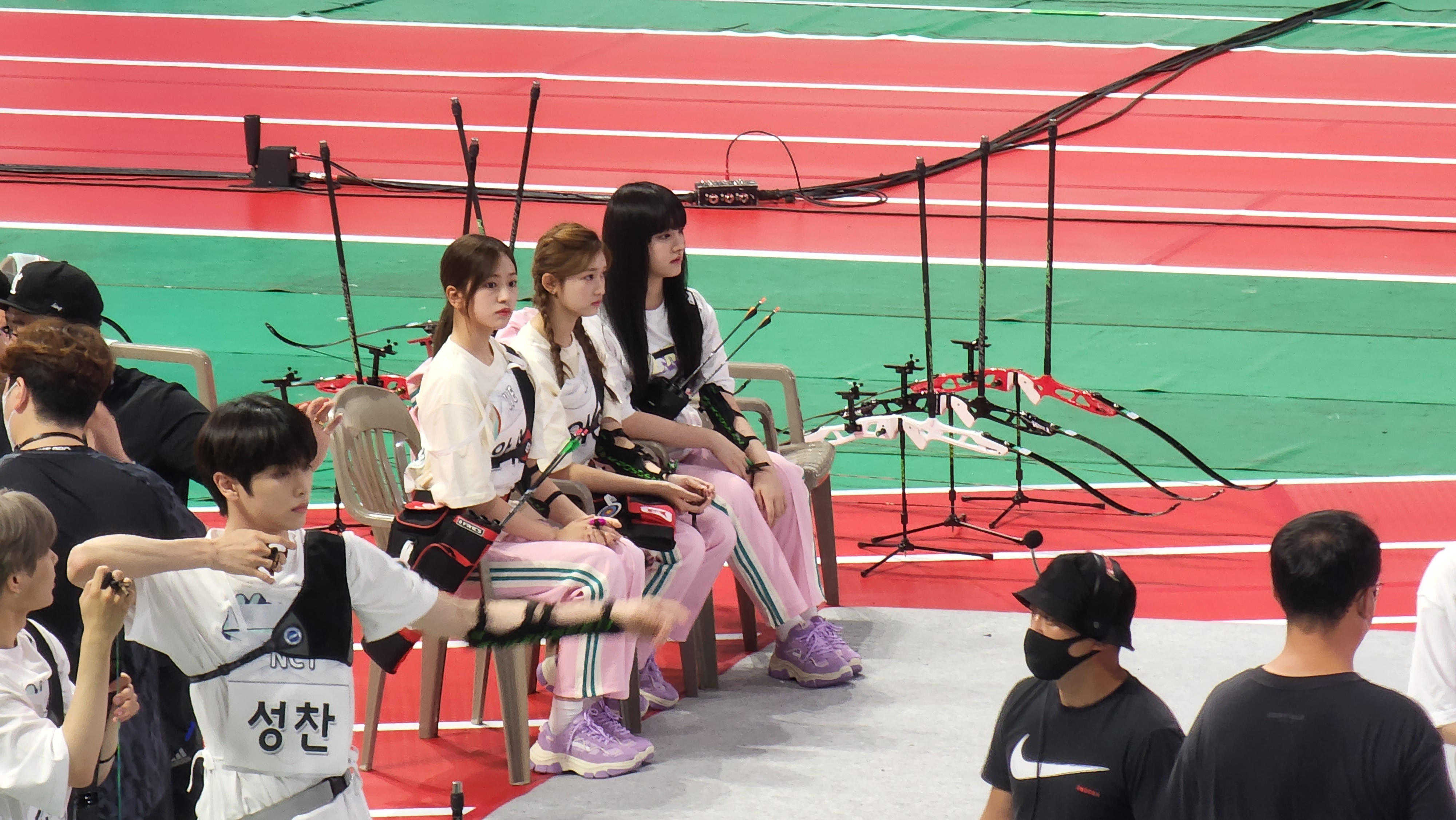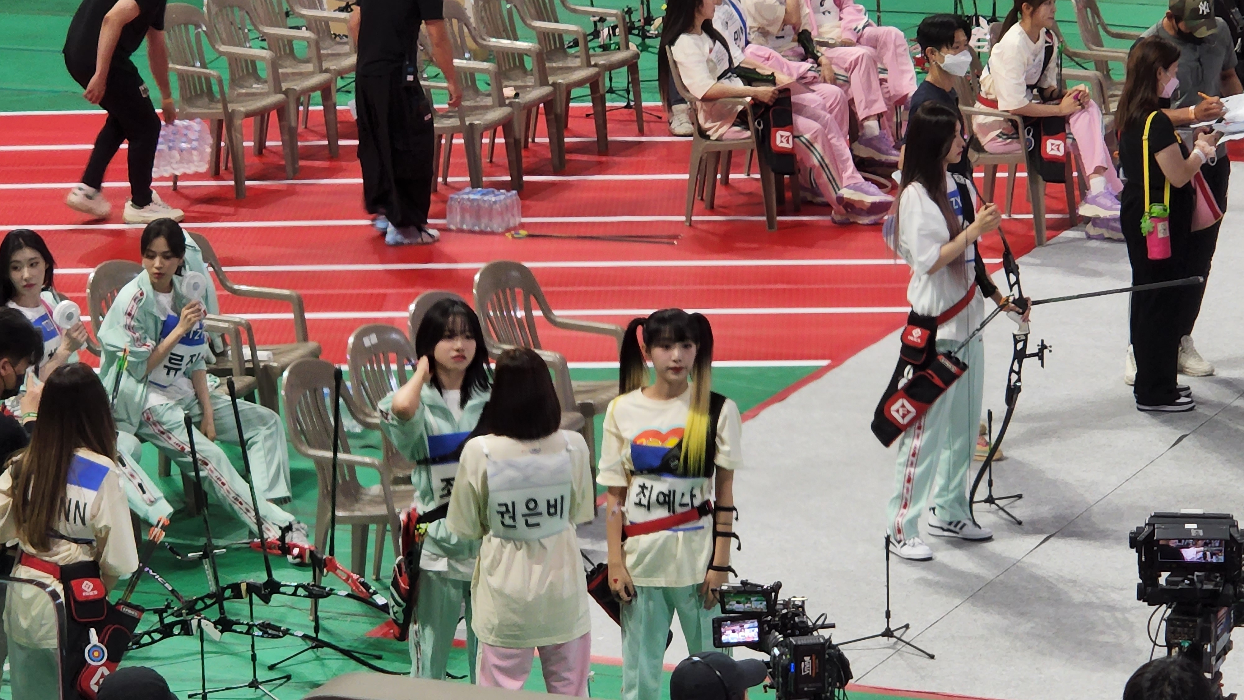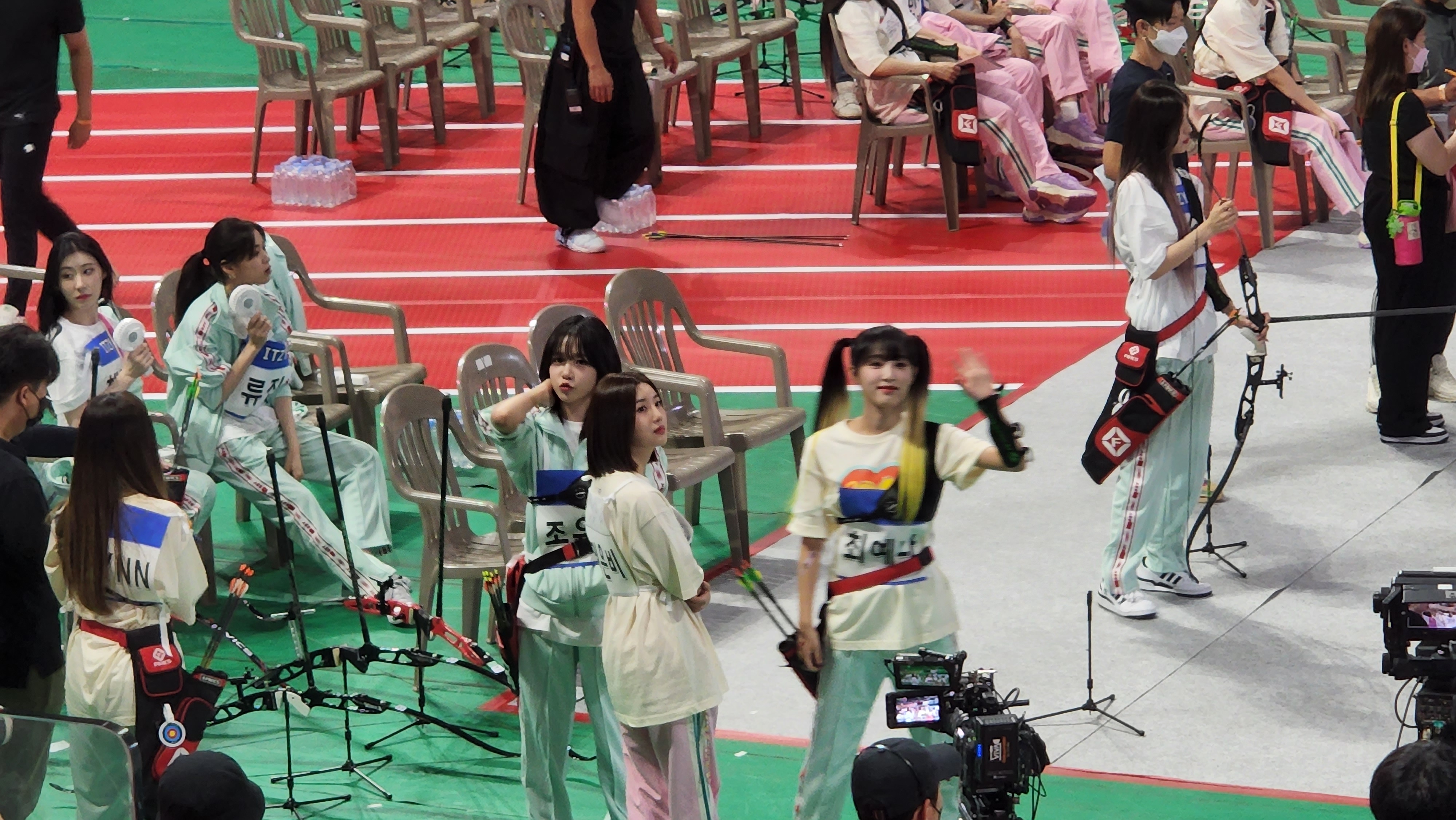 하... 근데 입장하고 팬석에 앉으니까 이미 양궁 시작하고 있었음. 그래도 아이브랑 솔로연합 대결할 때부터 보긴 했지만... 은비랑 유리, 예나 같이 서있길래 사진 찍는데 팬매들이 찍지 말라고 디펜스 계속 들어옴...