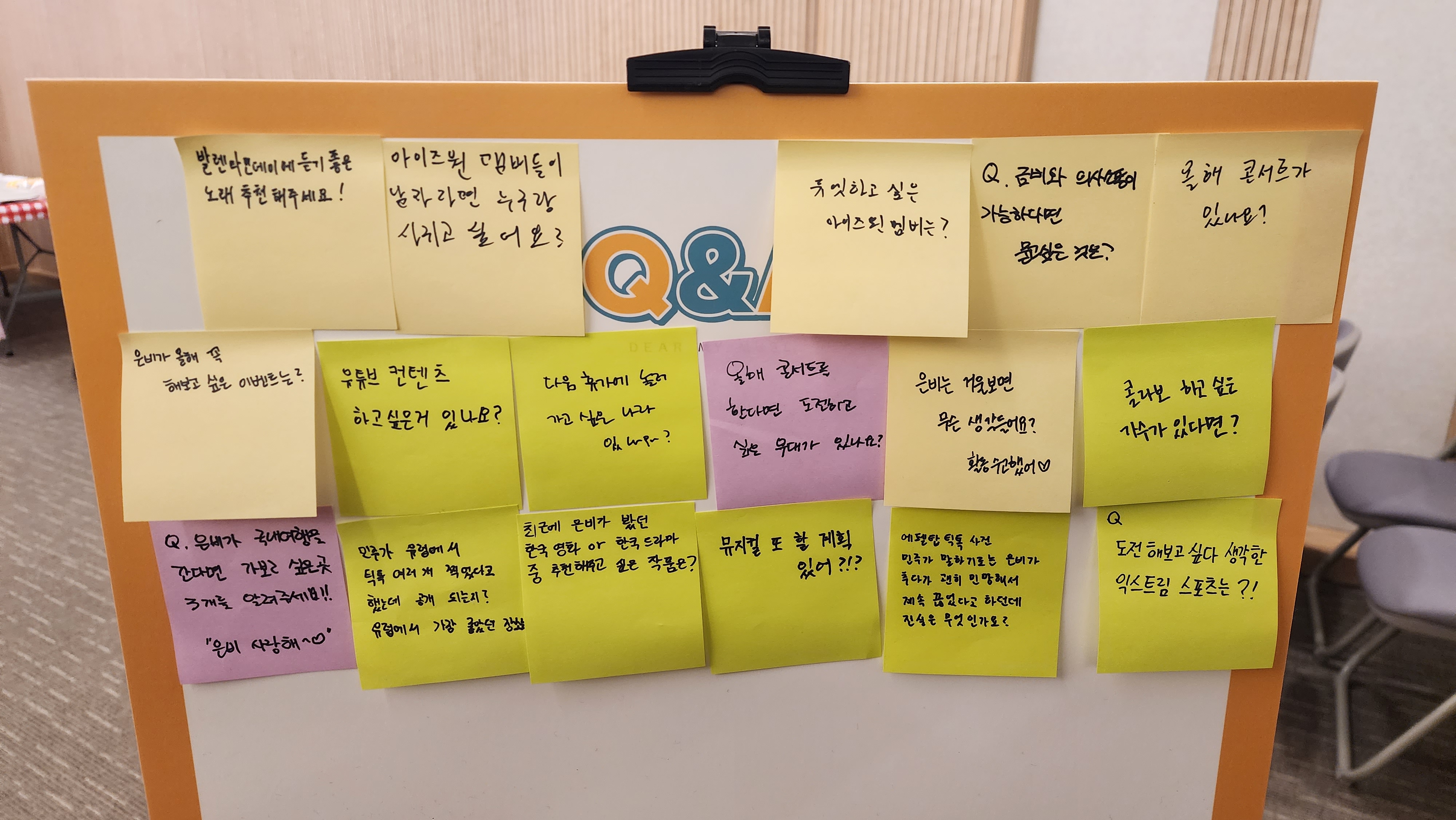 번호표팔찌차고 지하 홀로 내려가니까 스탭이 포스트잇에 Q&A 질문 적으라고 하더라. 계속 안 적으신 분들 적으라고 한 명도 빠짐없이 적어야 된다고 말함.